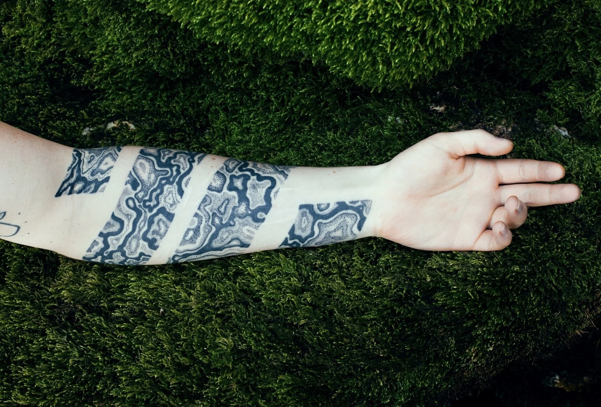 J’ai découvert cette pierre en 2016 et ai été fascinée par ses strates et textures. Elles ont inspiré ce motif que je réalise aujourd’hui directement en free machine (sans feutre ni stencil, directement sur la peau à l’instinct)